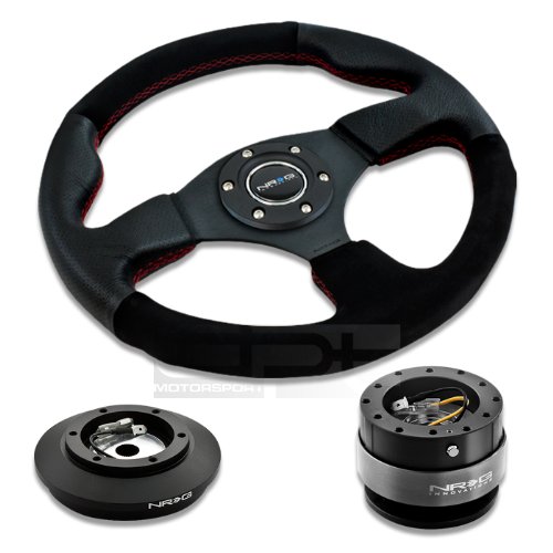 NRG-SRK-121H+012R-S+200BK, NRG Innovations 12.5" 320mm Black Leather Red Stitch Suede Grip Racing Steering Wheel Combo with 6 Hole Short Hub Adapter with Gen 2.0 Black Quick Release Kit SRK-121H